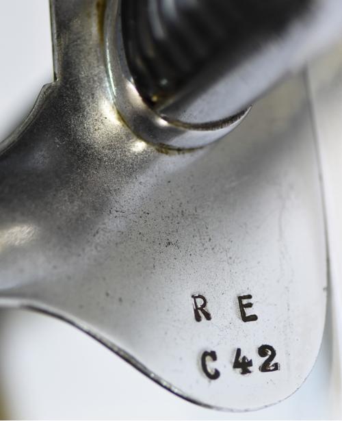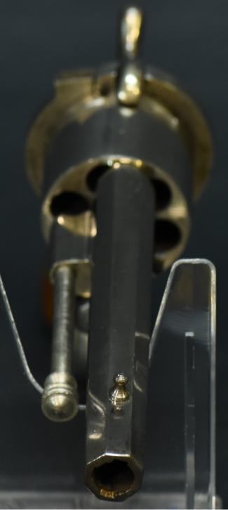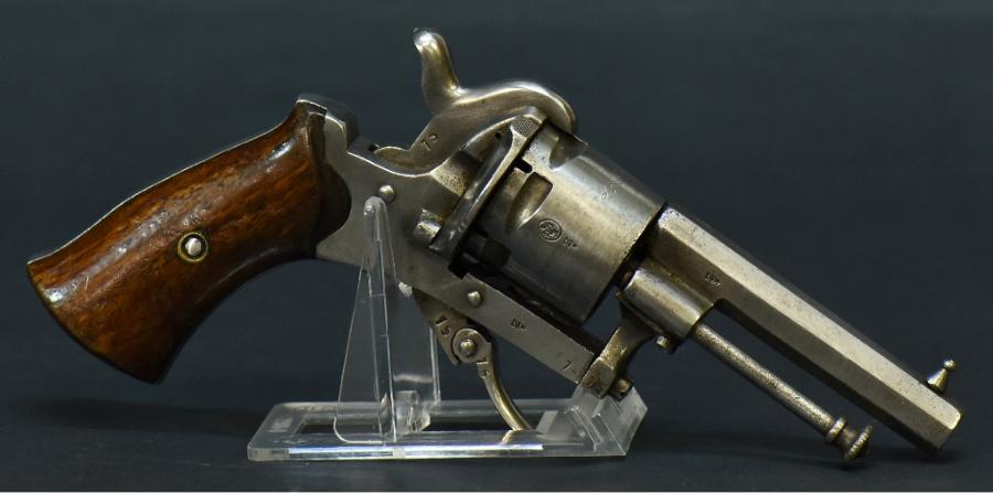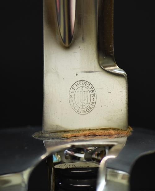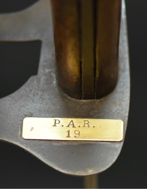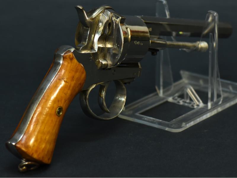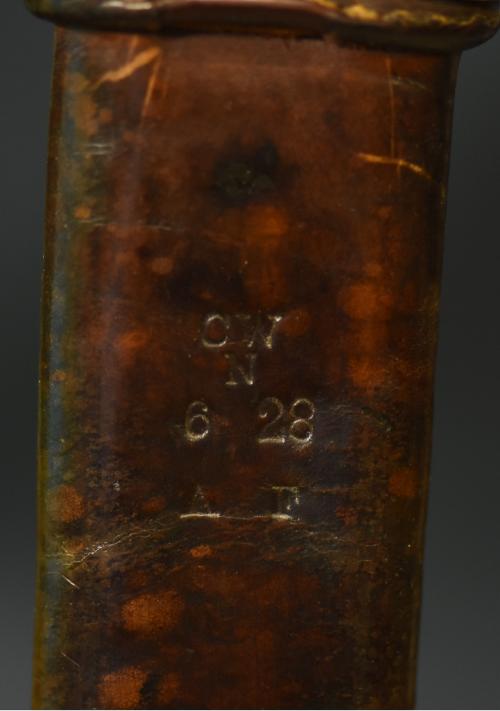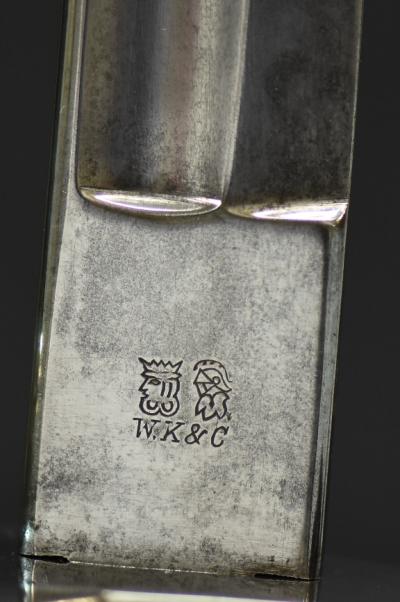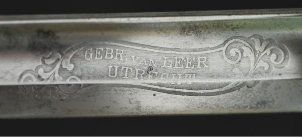 Top ^Klik op de foto’s voor een vergroting. Top ^Top ^Alle (vuur-)wapens in onze collectie zijn vrij te bezitten en te koop voor personen boven de 18 jaar. Penvuurrevolver, circa 1860.Luiks gekeurd.Vernikkelde monturen. 6-schots. Lengte totaal 24cm.Prijs: €.750,-Engels koppel vuursteenzakpistolen.Maker: Forth, York.Circa 1800. Engelse keuren. Afschroefbare lopen. Lengte: 17.5cm.Prijs: €.1650,-Klewang KNIL M1911.Maker: Hembrug.Schede: CW N 6 28 A F.Plaatje op gevest: P.A.R. 19 (Stadspolitie Djokjakarta).Keurmeester: H/kroon.Vroege schede met korte onderband.Prijs: €.595,-Belgisch militair geweer M1867, Albini-Braendlin.Later in gebruik genomen als jachtgeweer.Kolf met gun checkering. Rijkelijk voorzien van keur- en kwaliteitsstempels.Totale lengte 130cm.Prijs: €.1250,-Top ^Sabeldraagriemen Koninklijke Marine.Voor o.a. het sabel M1882.Links: luxe uitvoering voor over de jas.Prijs: €.175,-Rechts: reguliere uitvoering voor onder de jas. Met opsteekhaak. Prijs: €.125,-Penvuurrevolver, circa 1860.Luiks gekeurd. Onderdelen nummergelijk.6-schots. Lengte totaal 17cm.Prijs: €.625,-Fouragère voor Ritmeester der Cavalerie.Twee kasten met boullions. In uitstekende staat. Schitterende toevoeging aan iedere collectie!Prijs: €.175,- DE: Beierse Pickelhaube M1848.Landwehr.Prijs op aanvraag.Portepees / sabelkwasten voor Koninklijke Marine / Korps Mariniers.Voor o.a. de sabels M1882 en M1854.Links: Rangen tot en met LtZ 2e klas.Prijs: €.85,-Rechts: Rangen LtZ 1e klas en hoger. Prijs: VERKOCHTNederlandse fouragère voor Luitenant-Kolonel. Vier kwasten met boullions.In uitmuntende staat. Schitterende toevoeging aan iedere collectie!Prijs: VERKOCHTSabeldraagriemen. Links: Korps Mariniers (sabel M1854).Met opsteekhaak. Prijs: €.125,-Rechts: Koninklijke Landmacht. Ophanging voor één oog. Met opsteekhaak. Voor o.a. de sabel M1912, M1895, M1852, etc. Prijs: VERKOCHTTop ^Top ^Sabel M1876 Officier der Cavalerie.Maker: W.K.&Cie, Solingen. Leverancier: Gebr. van Leer, Utrecht. Op de kling: Yzerhouwer. Greep omkleed met roggehuid. Vooroorlogs exemplaar. Demontabel.Kwast optioneel verkrijgbaar.Prijs: €.575,-DE: Beierse Raupenhelm M1868.Landwehr / Reservisten, manschappen.Ludwig II (R:1864-1886).Maat 56.Prijs op aanvraag.Nederlandse Portepees / sabelkwasten Koninklijke Landmacht. Van links naar rechts: - Portepee M1852 voor Officieren van het Regiment Jagers. Groen koord. Knot van pletzilver. Oranje hart.- Portepee voor Hoofd- en Opperofficieren. Naar Pruisisch model. Oranje hart. - Portepee voor Adjundant-Onderofficieren. Knot van pletzilver. Oranje hart. Nederlandse staatsiedegen, circa 1930-1950.Vuurverguld bronzen gevest en monturen.Opengewerkte pareerplaat met rijkswapen.Parelmoeren greepplaten.Fraai geëtste driekantige kling.Inclusief opbergfoudraal.Prijs: VERKOCHTSabel M1882 Officier der Koninklijke Marine.Maker: W.K.C., Solingen.Verguld bronzen gevest en monturen.Fraai geëtste kling met nautische motieven.Voor Luitenant-ter-Zee en hogere rangen. Kwast optioneel verkrijgbaar.Prijs: €.545,-Klewang Politie.Maker: E.&F. Hörster, Solingen.Zwartlederen schede.Vernikkeld gevest en monturen. Prijs: €.450,-Nederlandse giberne voor Officier der Artillerie.Patroontas met gekruiste kanonnen onder kroon. Bandelier met leeuwenmasker met ruimnaalden aan kettingen boven een schild met springende granaat.Zwart lakleder met verguld bronzen monturen. Prijs: €.645,-Steek en epauletten Koninklijke Marine.Voor subalterne officier.In de bijbehorende metalen kist.Vooroorlogs. Prijs:VERKOCHTDiverse Portepees / sabelkwasten en klewangdrager. Van links naar rechts: - Leren Portepee aan leren lis. Periode 1934-1940.- Leren Portepee aan zwart koord. Periode 1913-1934.- Leren klewangdrager. Scharnierend.- Britse portepee. Litho KNIL: Infanterie Oost-Indisch Leger in Marsch- en Klein Tenue. 1896.Ontwerp: J.P. de Veer.Afkomstig uit: ‘De Uniformen van de Nederlandsche Zee en Landmacht’.Uitgegeven in 1900. Fraai ingelijst.Prijs: €.145,-Duits Keizerlijk miniatuursabel.Bronzen gevest met voorstelling van Germania die de Duitse adelaar kroont.Geblauwde kling met inscriptie.Plus portepee.Prijs: €.